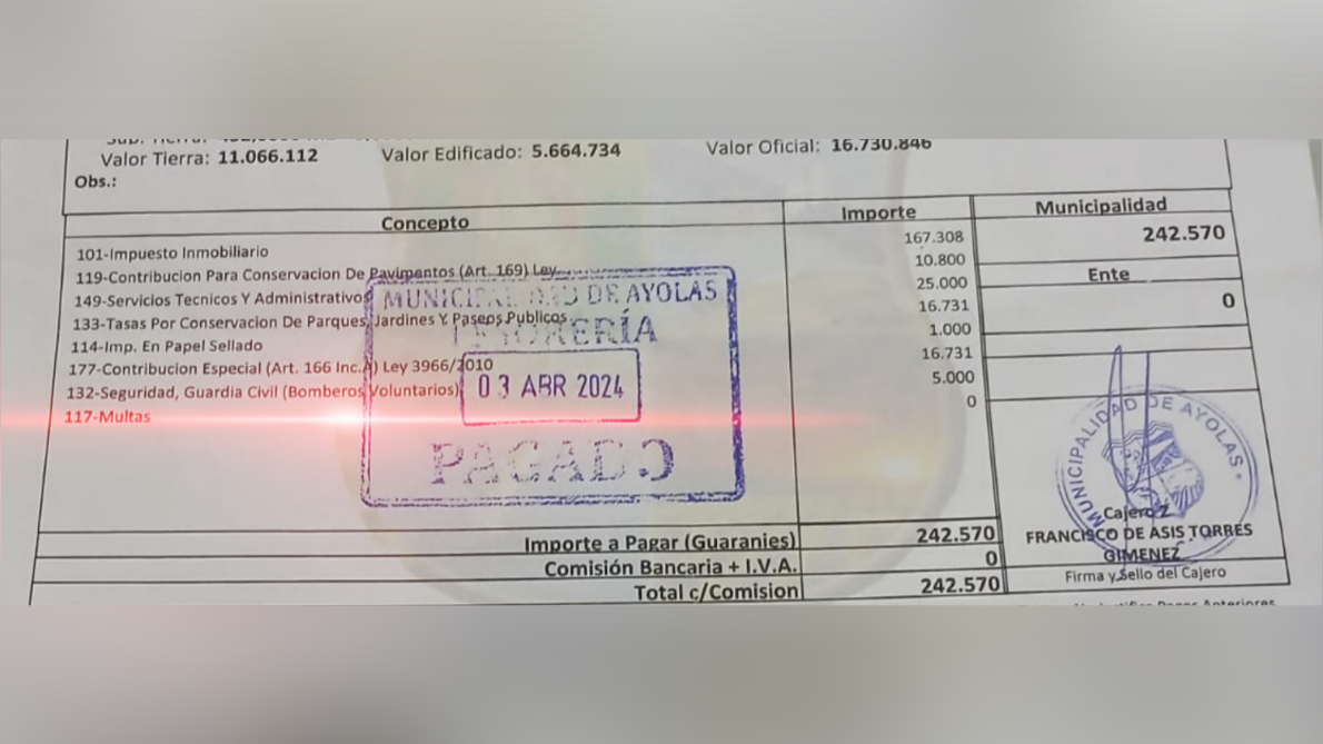 En los recibos de pago del impuesto inmobiliario que emite anualmente la Municipalidad de Ayolas figura, desde hace más de una década, un ítem denominado “Seguridad, Guardia Civil (Bomberos Voluntarios)”, con un monto de 5.000 guaraníes. Se trata de un cargo que cada contribuyente abona junto con otros conceptos municipales, bajo el supuesto de que ese dinero será destinado al fortalecimiento del servicio de bomberos de la ciudad.