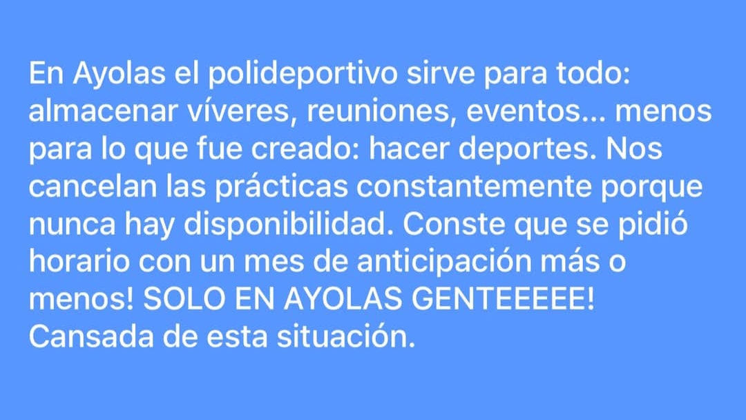 Adriana Vera, aseguró en su posteo, que a pesar de haberse solicitado horario para el lugar un mes antes, no pudo concretarse el uso, y el malestar recae sobre todo en los niños que forman parte del C-9, los doraditos de Ayolas. Una iniciativa juvenil de fútbol de salón que busca formar a jugadores y ayudar a la distracción sana de los pequeños.